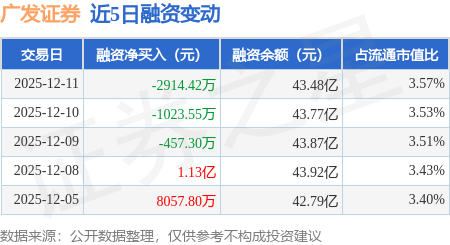 证券之星消息,12月11日,广发证券(000776)融资买入9850.52万元,融资偿还1.28亿元,融资净卖出2914.42万元,融资余额43.48亿元。