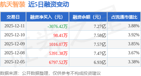证券之星消息,12月11日,航天智装(300455)融资买入1.47亿元,融资偿还1.78亿元,融资净卖出3076.42万元,融资余额7.27亿元,近20个交易日中有13个交易日出现融资净买入。
