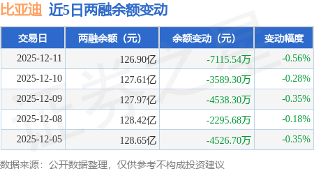证券之星消息,12月11日,比亚迪(002594)融资买入1.81亿元,融资偿还2.53亿元,融资净卖出7193.95万元,融资余额126.41亿元。