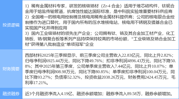 该股为有色 · 锆,钍基熔盐堆,核电概念热股,当日有色 · 锆概念上涨4.49%,钍基熔盐堆概念上涨4.42%,核电概念上涨3.36%。