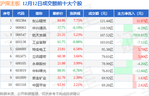 当日沪深主板成交额前10大个股中7只个股收涨,平均涨幅4.54%,其中东山精密(002384)以成交额121.44亿元排第一。从主力资金流入看,成交额前10大个股中有5只个股呈现主力资金净流入。