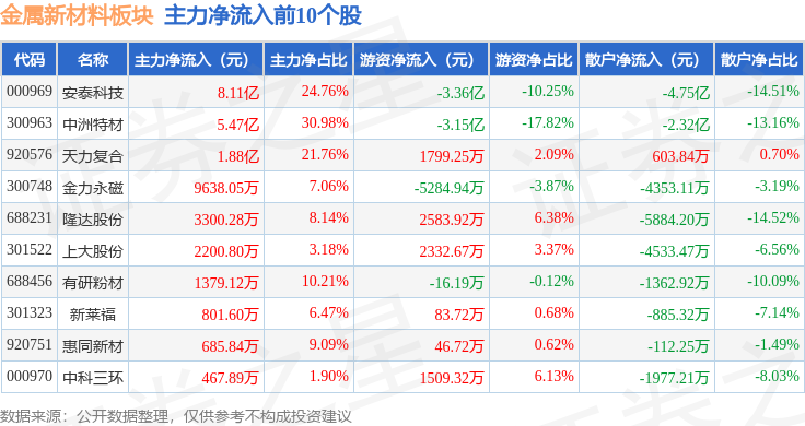 从资金流向上来看,当日金属新材料板块主力资金净流入11.9亿元,游资资金净流出5.83亿元,散户资金净流出6.07亿元。金属新材料板块个股资金流向见下表: