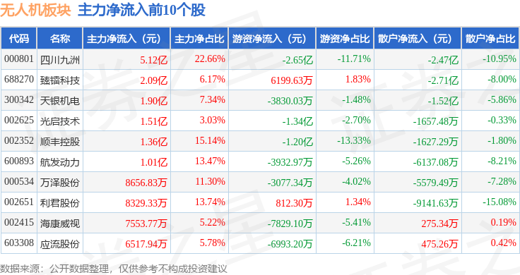 从资金流向上来看,当日无人机板块主力资金净流出19.56亿元,游资资金净流出3.66亿元,散户资金净流入23.23亿元。无人机板块个股资金流向见下表: