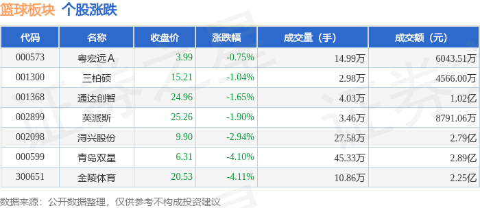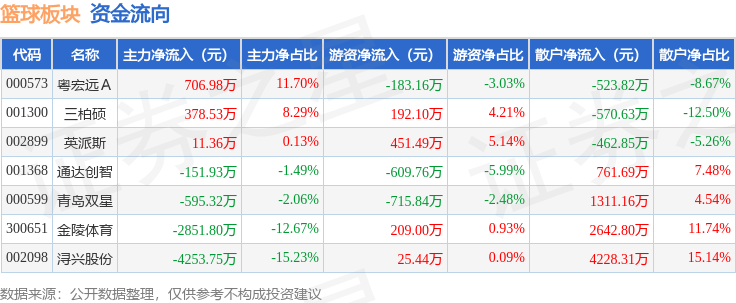 从资金流向上来看,当日篮球板块主力资金净流出6755.92万元,游资资金净流出630.74万元,散户资金净流入7386.66万元。篮球板块个股资金流向见下表: