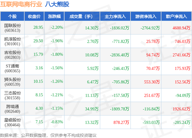 个股表现方面,互联网电商行业当日领跌股为国联股份(603613),该股当日报收28.95,下跌2.2%,成交量14.3万,主力资金净流出1836.02万元。凯淳股份(301001)以下跌1.96%紧随其后,该股当日成交量2.7万,主力资金净流出771.82万元。除此之外,吉宏股份(002803)、ST通葡(600365)、狮头股份(600539)均进入当日熊股之列。具体个股列表见下表: