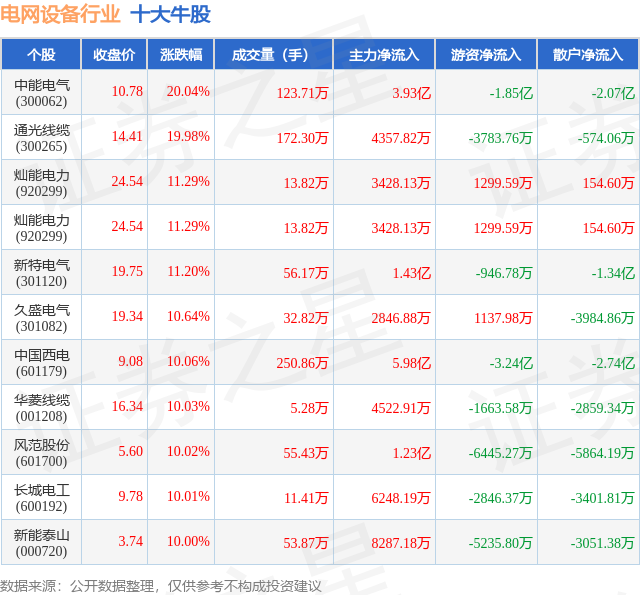 个股表现方面,电网设备行业当日领涨股为中能电气(300062),该股当日报收10.78,上涨20.04%,成交量123.71万,主力资金净流入3.93亿元。通光线缆(300265)以上涨19.98%紧随其后,该股当日成交量172.3万,主力资金净流入4357.82万元。除此之外,灿能电力(920299)、灿能电力(920299)、新特电气(301120)均进入当日牛股之列。具体个股列表见下表: