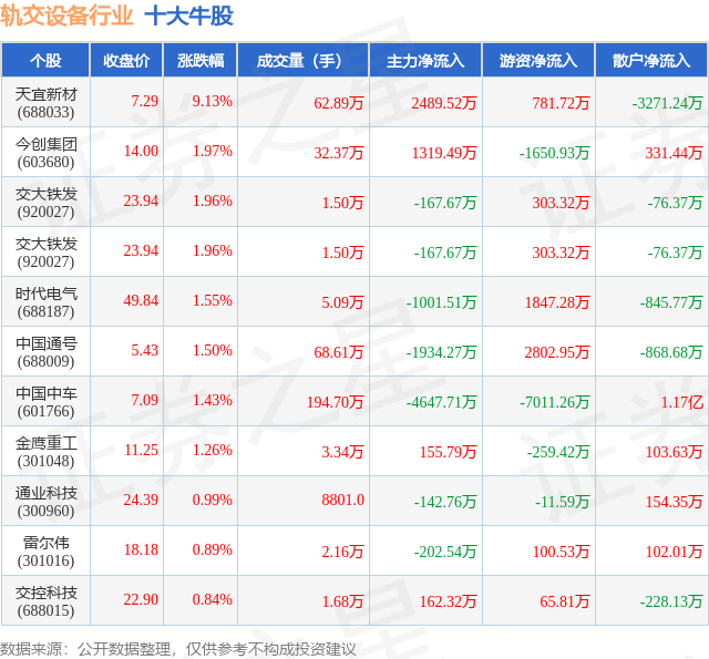 个股表现方面,轨交设备行业当日领涨股为天宜新材(688033),该股当日报收7.29,上涨9.13%,成交量62.89万,主力资金净流入2489.52万元。今创集团(603680)以上涨1.97%紧随其后,该股当日成交量32.37万,主力资金净流入1319.49万元。除此之外,交大铁发(920027)、交大铁发(920027)、时代电气(688187)均进入当日牛股之列。具体个股列表见下表: