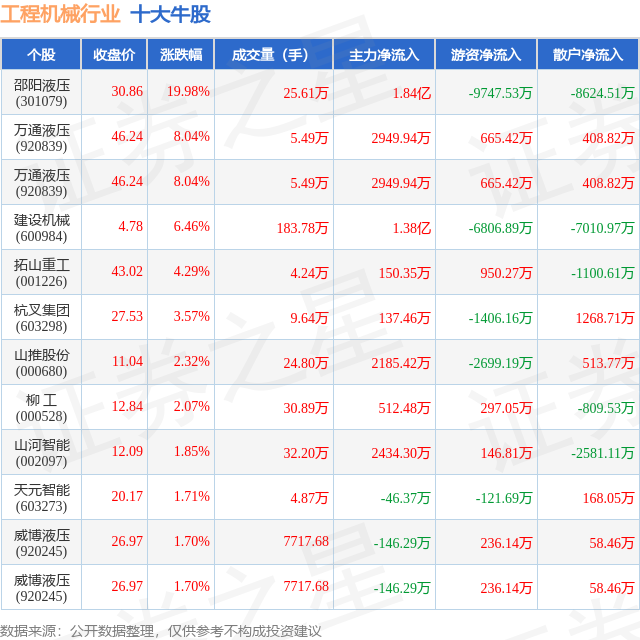 个股表现方面,工程机械行业当日领涨股为邵阳液压(301079),该股当日报收30.86,上涨19.98%,成交量25.61万,主力资金净流入1.84亿元。万通液压(920839)以上涨8.04%紧随其后,该股当日成交量5.49万,主力资金净流入2949.94万元。除此之外,万通液压(920839)、建设机械(600984)、拓山重工(001226)均进入当日牛股之列。具体个股列表见下表:
