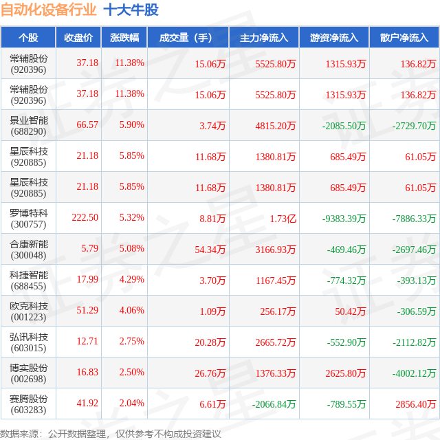 个股表现方面,自动化设备行业当日领涨股为常辅股份(920396),该股当日报收37.18,上涨11.38%,成交量15.06万,主力资金净流入5525.8万元。常辅股份(920396)以上涨11.38%紧随其后,该股当日成交量15.06万,主力资金净流入5525.8万元。除此之外,景业智能(688290)、星辰科技(920885)、星辰科技(920885)均进入当日牛股之列。具体个股列表见下表: