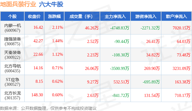个股表现方面,地面兵装行业当日领涨股为内蒙一机(600967),该股当日报收16.42,上涨2.11%,成交量46.26万,主力资金净流出4748.83万元。捷强装备(300875)以上涨1.44%紧随其后,该股当日成交量2.52万,主力资金净流出90.44万元。除此之外,天秦装备(300922)、北方导航(600435)、ST应急(300527)均进入当日牛股之列。具体个股列表见下表: