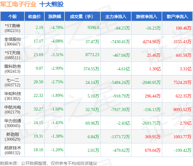 个股表现方面,军工电子行业当日领跌股为*ST奥维(002231),该股当日报收2.19,下跌4.78%,成交量9396.0,主力资金净流出84.23万元。全信股份(300447)以下跌4.08%紧随其后,该股当日成交量37.47万,主力资金净流出7430.41万元。除此之外,*ST天微(688511)、雷科防务(002413)、七一二(603712)均进入当日熊股之列。具体个股列表见下表: