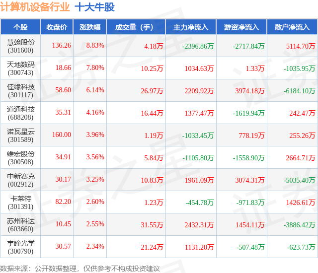 个股表现方面,计算机设备行业当日领涨股为慧翰股份(301600),该股当日报收136.26,上涨8.83%,成交量4.18万,主力资金净流出2396.86万元。天地数码(300743)以上涨7.8%紧随其后,该股当日成交量10.25万,主力资金净流入1034.63万元。除此之外,佳缘科技(301117)、道通科技(688208)、诺瓦星云(301589)均进入当日牛股之列。具体个股列表见下表: