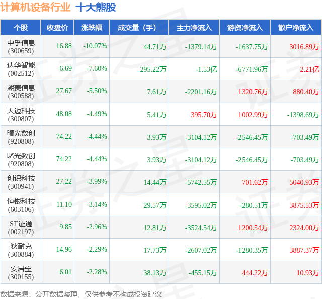 个股表现方面,计算机设备行业当日领跌股为中孚信息(300659),该股当日报收16.88,下跌10.07%,成交量44.71万,主力资金净流出1379.14万元。达华智能(002512)以下跌7.6%紧随其后,该股当日成交量295.22万,主力资金净流出1.53亿元。除此之外,熙菱信息(300588)、天迈科技(300807)、曙光数创(920808)均进入当日熊股之列。具体个股列表见下表: