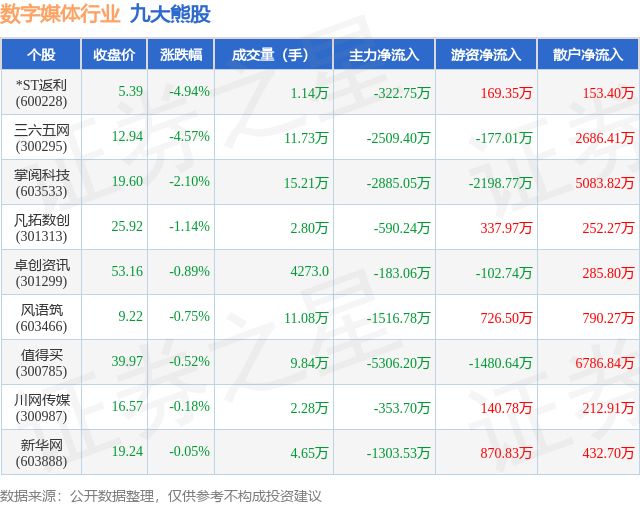 个股表现方面,数字媒体行业当日领跌股为*ST返利(600228),该股当日报收5.39,下跌4.94%,成交量1.14万,主力资金净流出322.75万元。三六五网(300295)以下跌4.57%紧随其后,该股当日成交量11.73万,主力资金净流出2509.4万元。除此之外,掌阅科技(603533)、凡拓数创(301313)、卓创资讯(301299)均进入当日熊股之列。具体个股列表见下表: