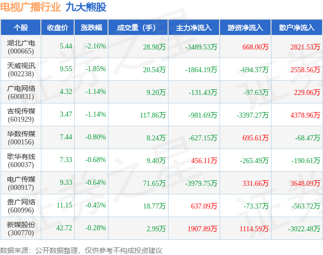 个股表现方面,电视广播行业当日领跌股为湖北广电(000665),该股当日报收5.44,下跌2.16%,成交量28.98万,主力资金净流出3489.53万元。天威视讯(002238)以下跌1.85%紧随其后,该股当日成交量20.54万,主力资金净流出1864.19万元。除此之外,广电网络(600831)、吉视传媒(601929)、华数传媒(000156)均进入当日熊股之列。具体个股列表见下表: