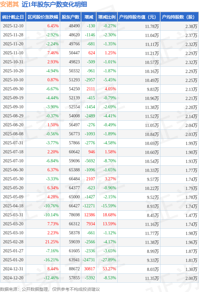 从股价来看,2025年11月28日至2025年12月10日,安诺其区间涨幅为6.45%,在此期间股东户数减少130.0户,减幅为0.27%。