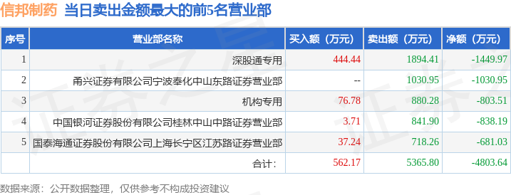证券之星消息,沪深交易所2025年12月12日公布的交易公开信息显示,信邦制药(002390)因日跌幅偏离值达到7%的前5只证券登上龙虎榜。此次是近5个交易日内第1次上榜。