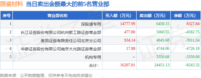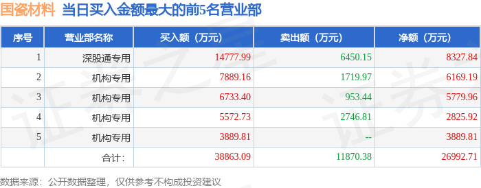 证券之星消息,沪深交易所2025年12月12日公布的交易公开信息显示,国瓷材料(300285)因日涨幅达到15%的前5只证券登上龙虎榜。此次是近5个交易日内第1次上榜。