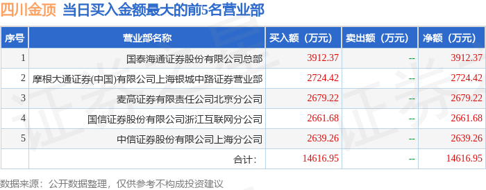 证券之星消息,沪深交易所2025年12月12日公布的交易公开信息显示,四川金顶(600678)因有价格涨跌幅限制的日换手率达到20%的前五只证券登上龙虎榜。此次是近5个交易日内第4次上榜。
