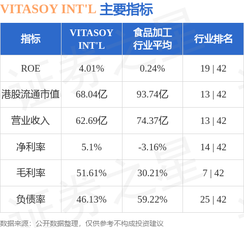 VITASOY INT'L港股市值68.04亿港元,在食品加工行业中排名第13。主要指标见下表: