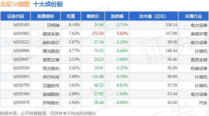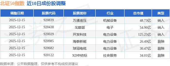 近10日内北证50(899050)指数成份股做了调整,新纳入了3只股票,剔除了3只股票。