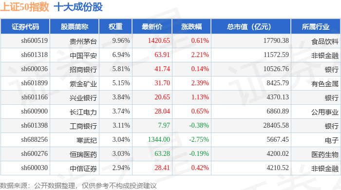 证券之星消息,12月12日,上证50(000016)指数报收于2994.64点,涨0.59%,成交1372.58亿元,换手率0.34%。当日该指数成份股中,上涨的有32家,中微公司以4.29%的涨幅领涨,下跌的有16家,寒武纪以2.75%的跌幅领跌。