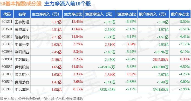 资金流向方面,50基本(000052)指数成份股当日主力资金净流出合计15.68亿元,游资资金净流入合计8.98亿元,散户资金净流入合计6.7亿元。成份股资金流向详情见下表: