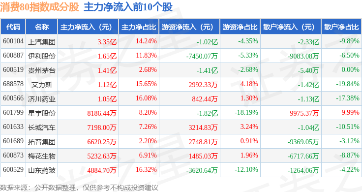 资金流向方面,消费80(000069)指数成份股当日主力资金净流出合计24.05亿元,游资资金净流入合计6.11亿元,散户资金净流入合计17.94亿元。成份股资金流向详情见下表: