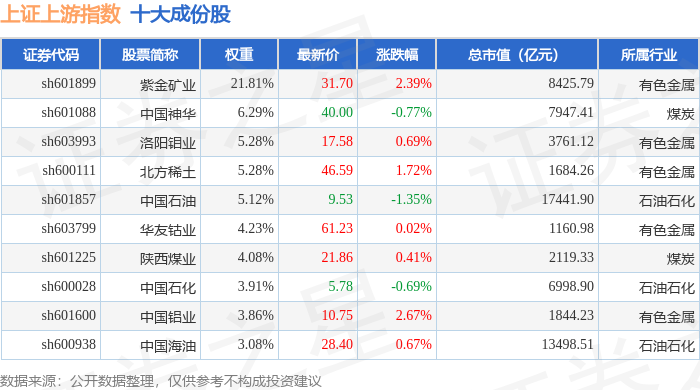证券之星消息,12月12日,上证上游(000094)指数报收于4275.62点,涨1.13%,成交535.76亿元,换手率0.66%。当日该指数成份股中,上涨的有30家,西部超导以7.18%的涨幅领涨,下跌的有15家,兰花科创以1.66%的跌幅领跌。