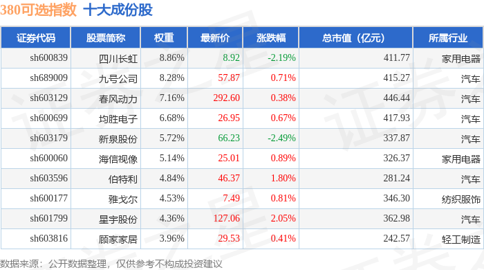 证券之星消息,12月12日,380可选(000107)指数报收于5548.78点,跌0.07%,成交111.77亿元,换手率1.37%。当日该指数成份股中,上涨的有19家,星宇股份以2.05%的涨幅领涨,下跌的有15家,喜临门以4.63%的跌幅领跌。