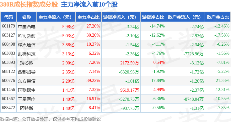 资金流向方面,380R成长(000119)指数成份股当日主力资金净流入合计23.78亿元,游资资金净流出合计29.71亿元,散户资金净流入合计5.92亿元。成份股资金流向详情见下表: