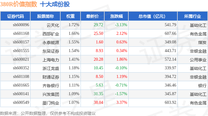 证券之星消息,12月12日,380R价值(000120)指数报收于9346.7点,涨0.65%,成交1335.84亿元,换手率1.66%。当日该指数成份股中,上涨的有165家,中国西电以10.06%的涨幅领涨,下跌的有108家,福蓉科技以6.87%的跌幅领跌。