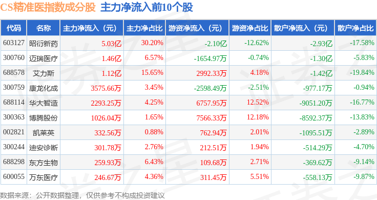 资金流向方面,CS精准医(000863)指数成份股当日主力资金净流出合计6.09亿元,游资资金净流入合计5.97亿元,散户资金净流入合计1243.22万元。成份股资金流向详情见下表: