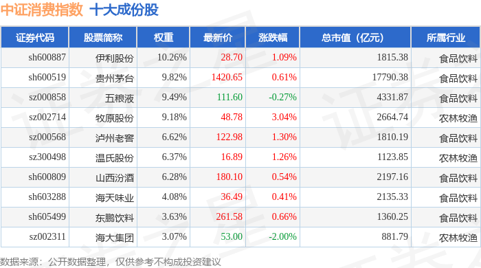 证券之星消息,12月12日,中证消费(000932)指数报收于15417.29点,涨0.55%,成交261.36亿元,换手率0.95%。当日该指数成份股中,上涨的有24家,牧原股份以3.04%的涨幅领涨,下跌的有15家,新诺威以8.42%的跌幅领跌。