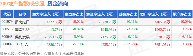 资金流向方面,300地产(000952)指数成份股当日主力资金净流出合计1.18亿元,游资资金净流出合计6617.29万元,散户资金净流入合计1.84亿元。成份股资金流向详情见下表: