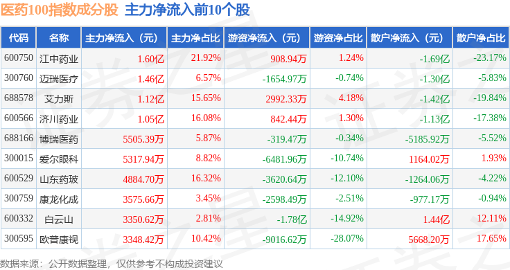 资金流向方面,医药100(000978)指数成份股当日主力资金净流出合计9.67亿元,游资资金净流入合计2.56亿元,散户资金净流入合计7.11亿元。成份股资金流向详情见下表:
