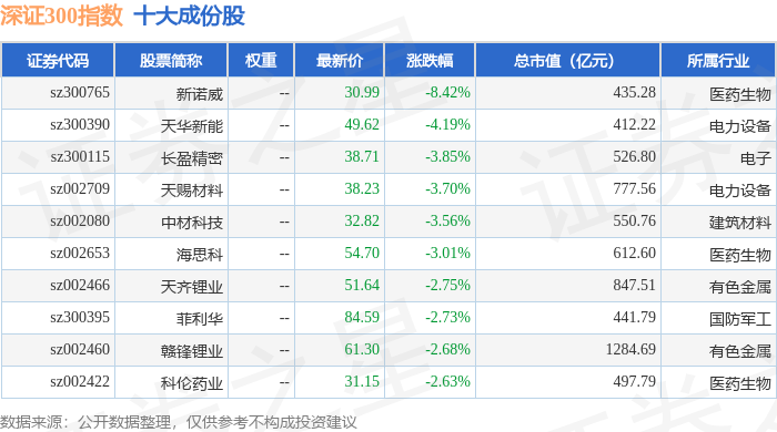 证券之星消息,12月12日,深证300(399007)指数报收于5610.66点,涨0.84%,成交4304.41亿元,换手率1.56%。当日该指数成份股中,上涨的有216家,国瓷材料以20.02%的涨幅领涨,下跌的有75家,新诺威以8.42%的跌幅领跌。
