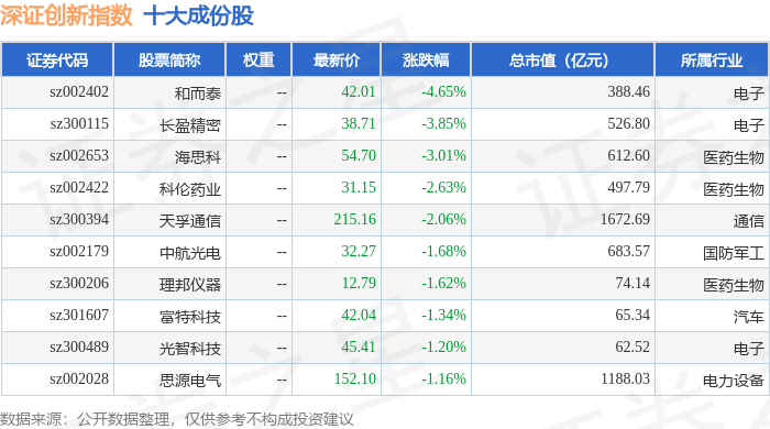 深证创新(399016)指数十大成份股详情如下: