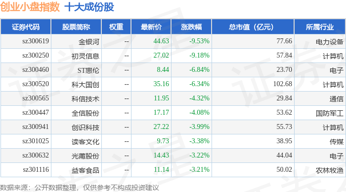 创业小盘(399020)指数十大成份股详情如下: