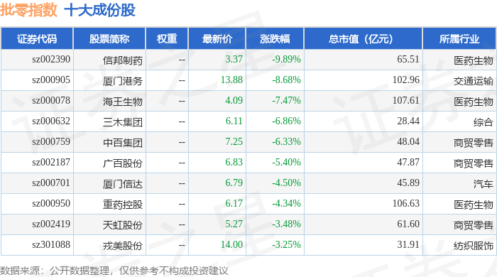 资金流向方面,批零指数(399236)成份股当日主力资金净流出合计8.92亿元,游资资金净流入合计6747.11万元,散户资金净流入合计8.24亿元。成份股资金流向详情见下表: