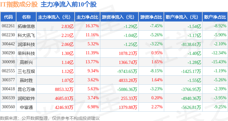 资金流向方面,IT指数(399239)成份股当日主力资金净流出合计18.79亿元,游资资金净流出合计3.18亿元,散户资金净流入合计21.97亿元。成份股资金流向详情见下表:
