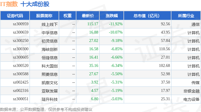 证券之星消息,12月12日,IT指数(399239)报收于1994.02点,涨0.59%,成交857.86亿元,换手率3.19%。当日该指数成份股中,上涨的有126家,新迅达以8.08%的涨幅领涨,下跌的有110家,线上线下以11.92%的跌幅领跌。