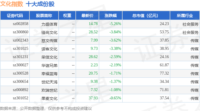 文化指数(399248)十大成份股详情如下: