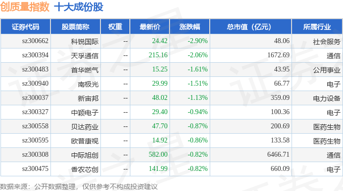 创质量(399269)指数十大成份股详情如下: