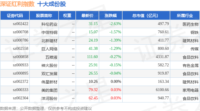 深证红利(399324)指数十大成份股详情如下: