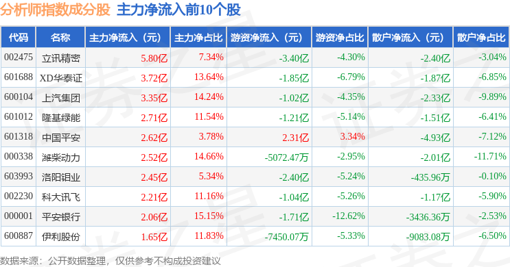 资金流向方面,分析师指数(399354)成份股当日主力资金净流出合计10.38亿元,游资资金净流出合计8.57亿元,散户资金净流入合计18.95亿元。成份股资金流向详情见下表:
