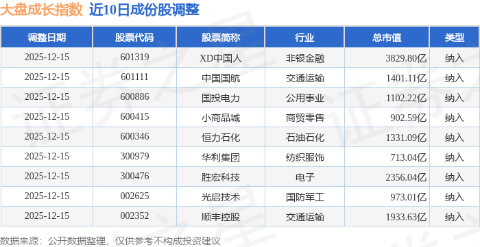 近10日内大盘成长(399372)指数成份股做了调整,新纳入了9只股票。