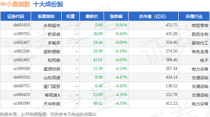 证券之星消息,12月12日,中小盘(399401)指数报收于4641.87点,涨1.07%,成交6048.9亿元,换手率1.83%。当日该指数成份股中,上涨的有549家,国瓷材料以20.02%的涨幅领涨,下跌的有225家,永辉超市以9.91%的跌幅领跌。