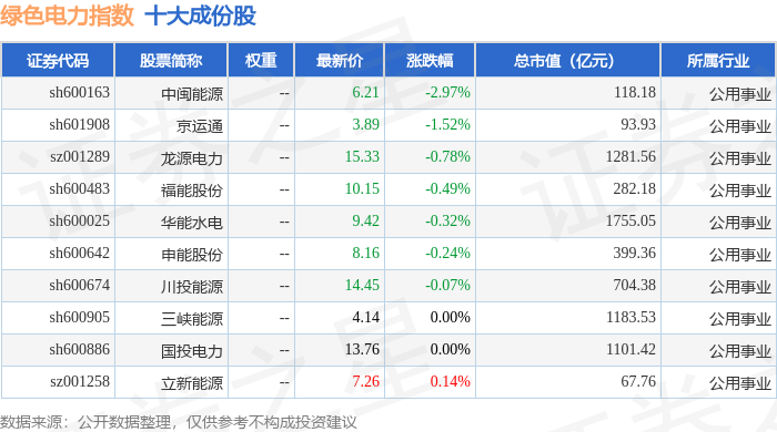 绿色电力(399438)指数十大成份股详情如下: