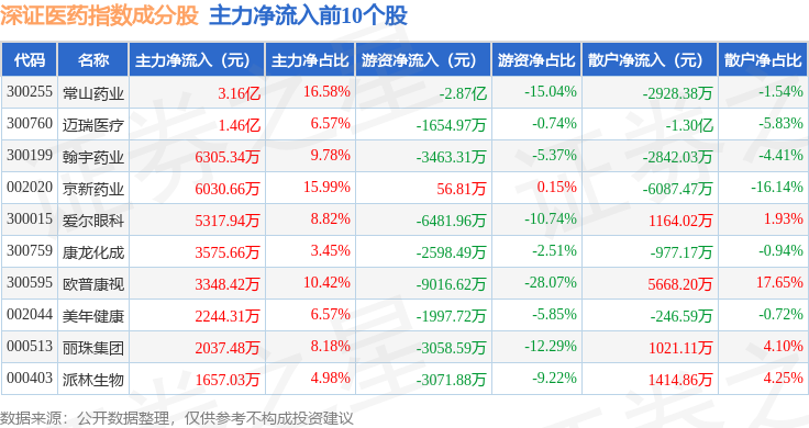 资金流向方面,深证医药(399618)指数成份股当日主力资金净流入合计3.3亿元,游资资金净流出合计6.39亿元,散户资金净流入合计3.09亿元。成份股资金流向详情见下表: